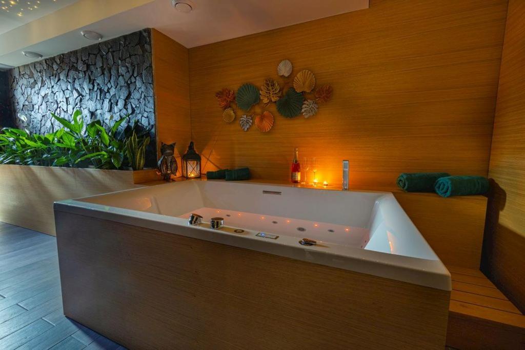 One-Bedroom Apartment. This luxurious apartment features a hot tub, a sauna and a fireplace. This spacious apartment comprises 1 living room, 1 separate bedroom and 2 bathrooms with a bath and bathrobes. Meals can be prepared in the kitchen, which is equipped with a stovetop, a refrigerator, a dishwasher and kitchenware. Featuring a terrace with garden views, this apartment also provides a washing machine and a flat-screen TV with cable channels. The unit offers 1 bed.